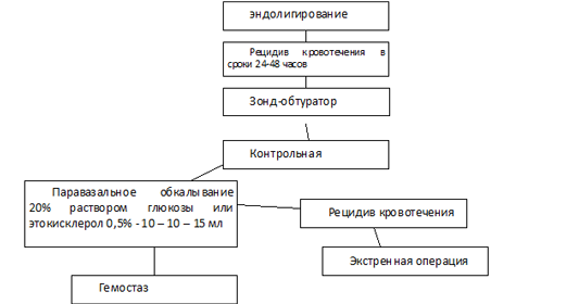 Довольно серьезным осложнением после операции является рецидив кровотечения после прорезывания лигатур в эзофагокардиальном отделе при прохождении пищевого комка. После введения зонда-обтуратора и остановки кровотечения окончательный гемостаз достигается эндоскопическим обкалыванием 0,5% раствора этоксисклерола места геморрагии 2, 4, 7).