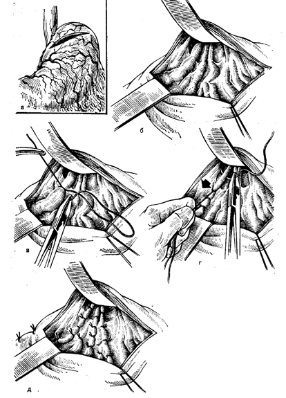 Производится верхняя срединная лапаротомия. На переднюю стенку желудка ближе к кардии накладываются капроновые швы-держалки, между которыми рассекают стенку желудка на протяжении 10÷12 см. Линия разреза проходит продольно от дна желудка по направлению к малой кривизне (рис № 21 a). После вскрытия просвета желудка и отсасывания его содержимого, в просвет желудка вводится зеркало, которым приподнимается верхняя часть передней стенки желудка. Затем хирург пальцами левой руки расправляет слизистую малой кривизны желудка ближе к пищеводному отверстию. Обычно этот прием дает возможность хорошо визуализировать варикозные вены кардии уходящие несколькими (обычно 3÷5) стволами в пищевод. Прошивание варикозно расширенных вен начинают, как правило, с малой кривизны желудка, с наиболее выраженного ствола отдельными узловыми швами (рисунок № 21 в-г).