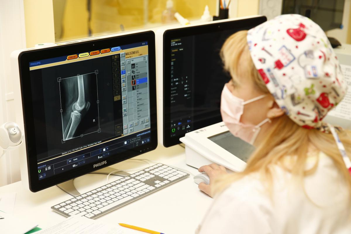 Первый этаж отдан под лучевую диагностику. Всего в корпусе 2 компьютерных томографа (64 и 128 тыс. срезов), 3 магнитно-резонансных томографа (1,5-3 Тесла), 3 рентгеновских аппарата как для обычных снимков, так и для рентгеноскопии.