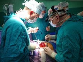 Наша встреча с ним проходила у операционного стола. Переодеваюсь в хирургический костюм, медсестра отводит в одну из десятков операционных в больнице. Владимир Алексеевич работает скальпелем. Расширители грудной клетки, зажимы, открытое лёгкое, указания ассистентам и, между делом, ответы на вопросы журналиста. Прошу его пояснить, какое вмешательство он завершает.