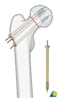 Со временем хирургическая техника применения канюлированных винтов АО изменилась в отношении расположения винтов. Винты также проводят параллельно через прокол кожи, один винт – по над малой кривизной, два винта – в центре шейки. Винты следует проводить в подвертельной области не ниже уровня малого вертела во избежание подвертельного перелома (рис.).